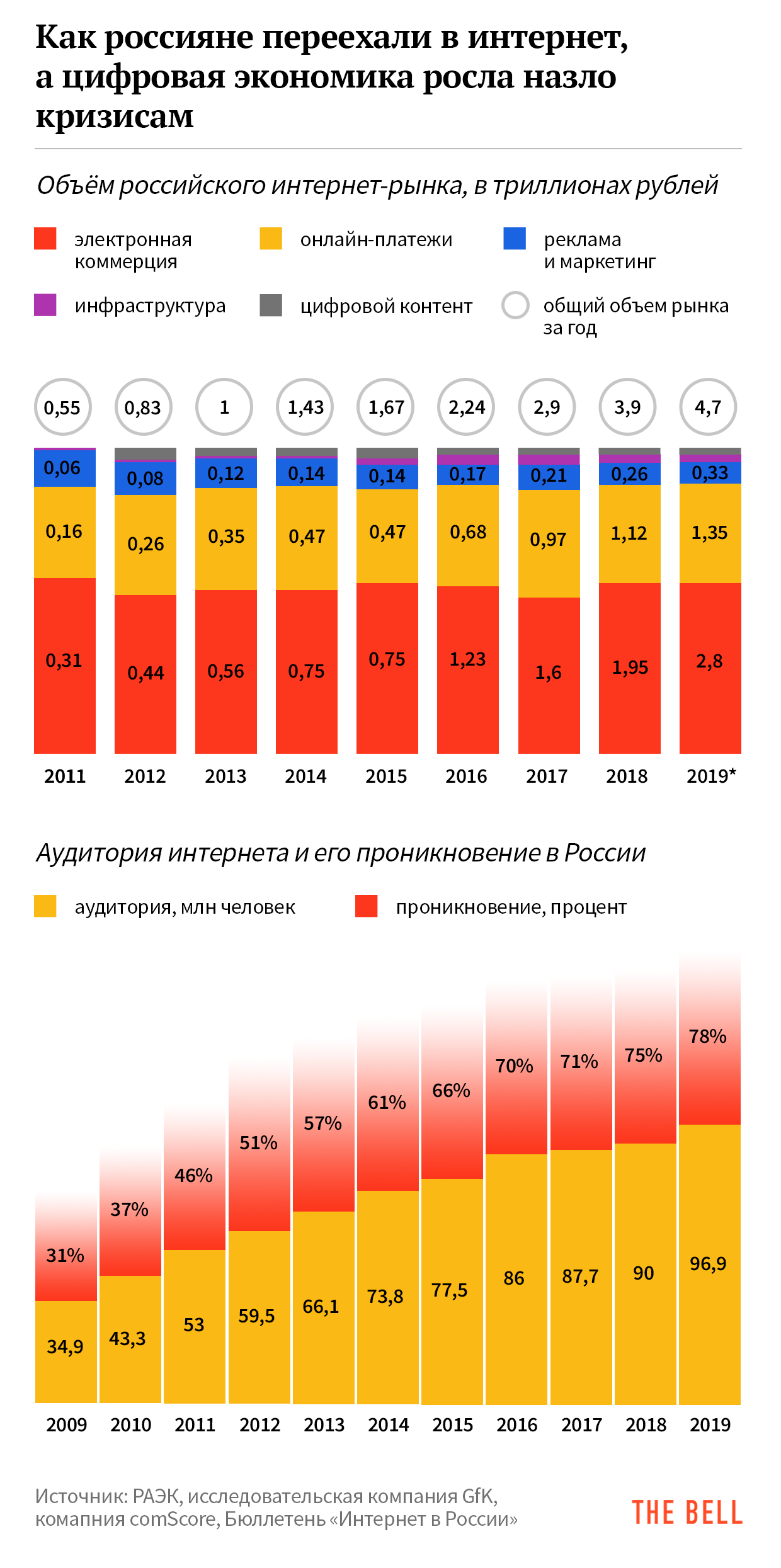 За 10 лет россияне переехали в интернет, в стране появились свои национальные чемпионы, а цифровая экономика выросла назло всем кризисам почти на порядок. Но под конец десятилетия за интернет взялось государство и уходить из него уже не собирается.