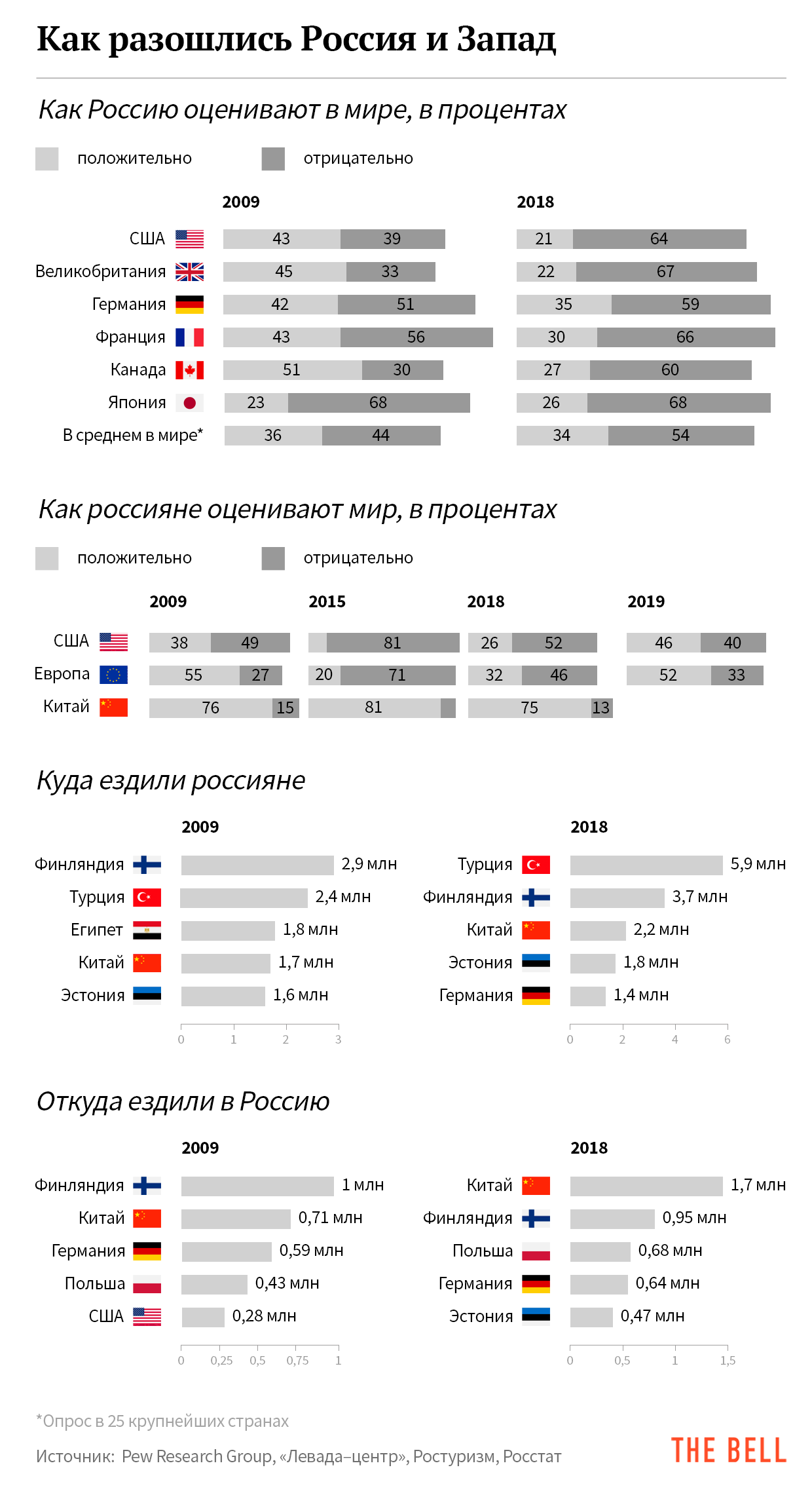 На рубеже 2010-х только что избранный президент США Барак Обама объявлял о перезагрузке отношений с Россией, Хиллари Клинтон и Сергей Лавров нажимали знаменитую красную кнопку, а Дмитрий Медведев обедал в Кремниевой долине то с Арнольдом Шварценеггером, то со Стивом Джобсом. Сейчас мы под международными санкциями, до 4 млн граждан — невыездные, а образ России в мире плох как никогда.