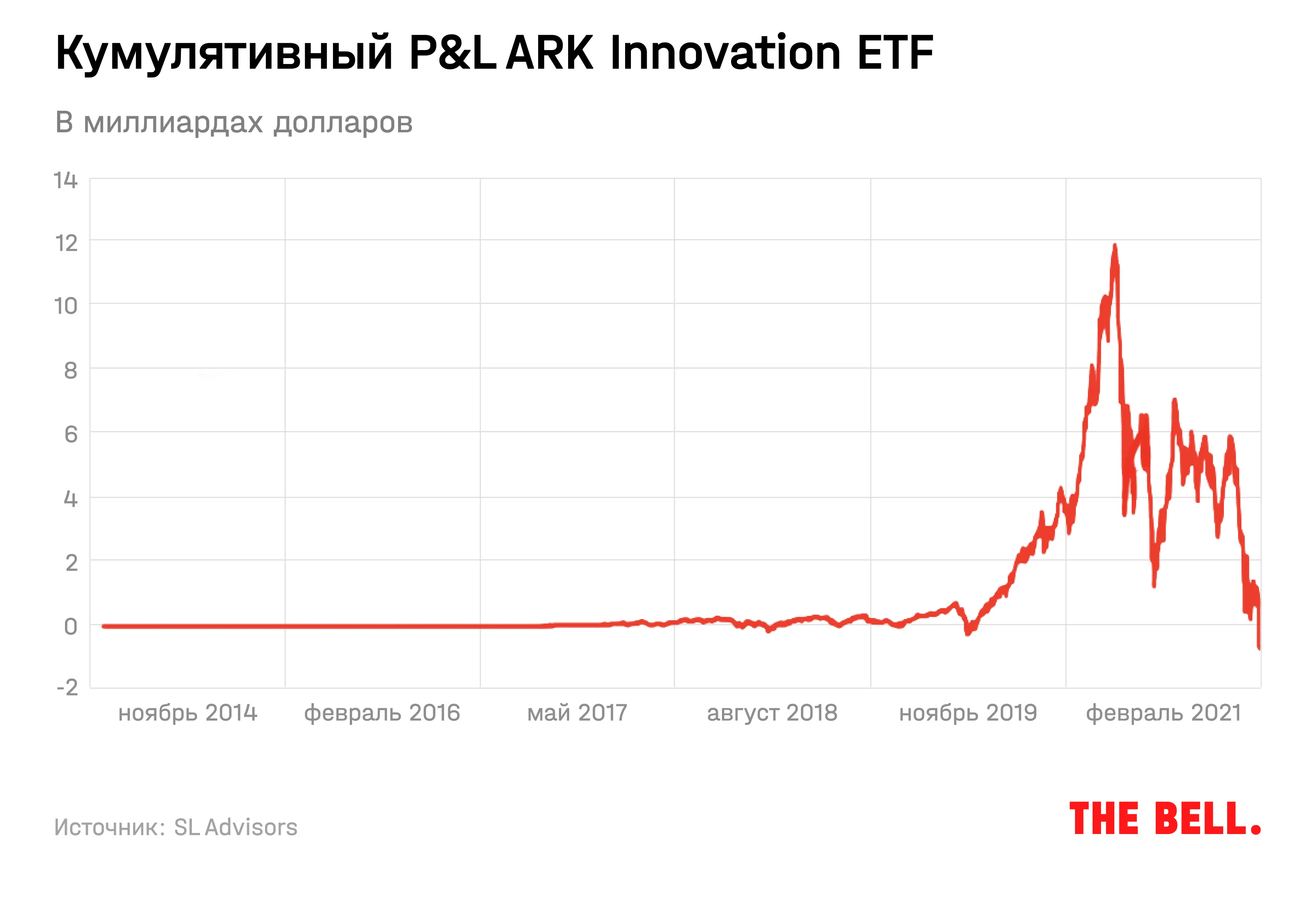 Однако большинство инвесторов этой доходности не увидели. Кумулятивный P&L (Profit and Loss), показывающий суммарную прибыль фонда за все время, в начале 2022 года впервые с 2019 года ушел в минус, хотя на пике в феврале 2021-го он составлял $12 млрд, показали расчеты Саймона Лака из SL Advisors. Иными словами, каждый доллар, вложенный в ARK Innovation, уменьшился.