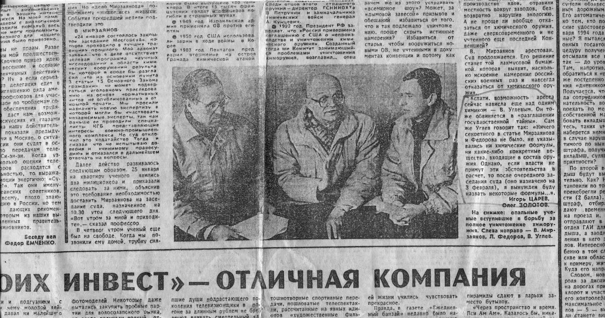 – Никакой роли в создании или хотя бы проработке методов синтеза или технологии «Новичка» у Мирзаянова не было, так как он был в ГОСНИИОХТ, насколько мне известно, начальником отдела противодействия иностранным разведкам. Его роль, как и роль его отдела, сводилась к разработке методов контроля и к контролю состояния воздушной среды над территорией ГОСНИИОХТ в Москве. Род его деятельности как ученого – хроматография.