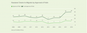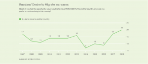 Рекорд. В 2018 году эмигрировать из России хотел каждый пятый россиянин (20%), следует из исследования Gallup. Это самая высокая доля за последние одиннадцать лет. Среди молодых людей этот показатель достиг рекордного уровня за последнее десятилетие и теперь составляет 44%.