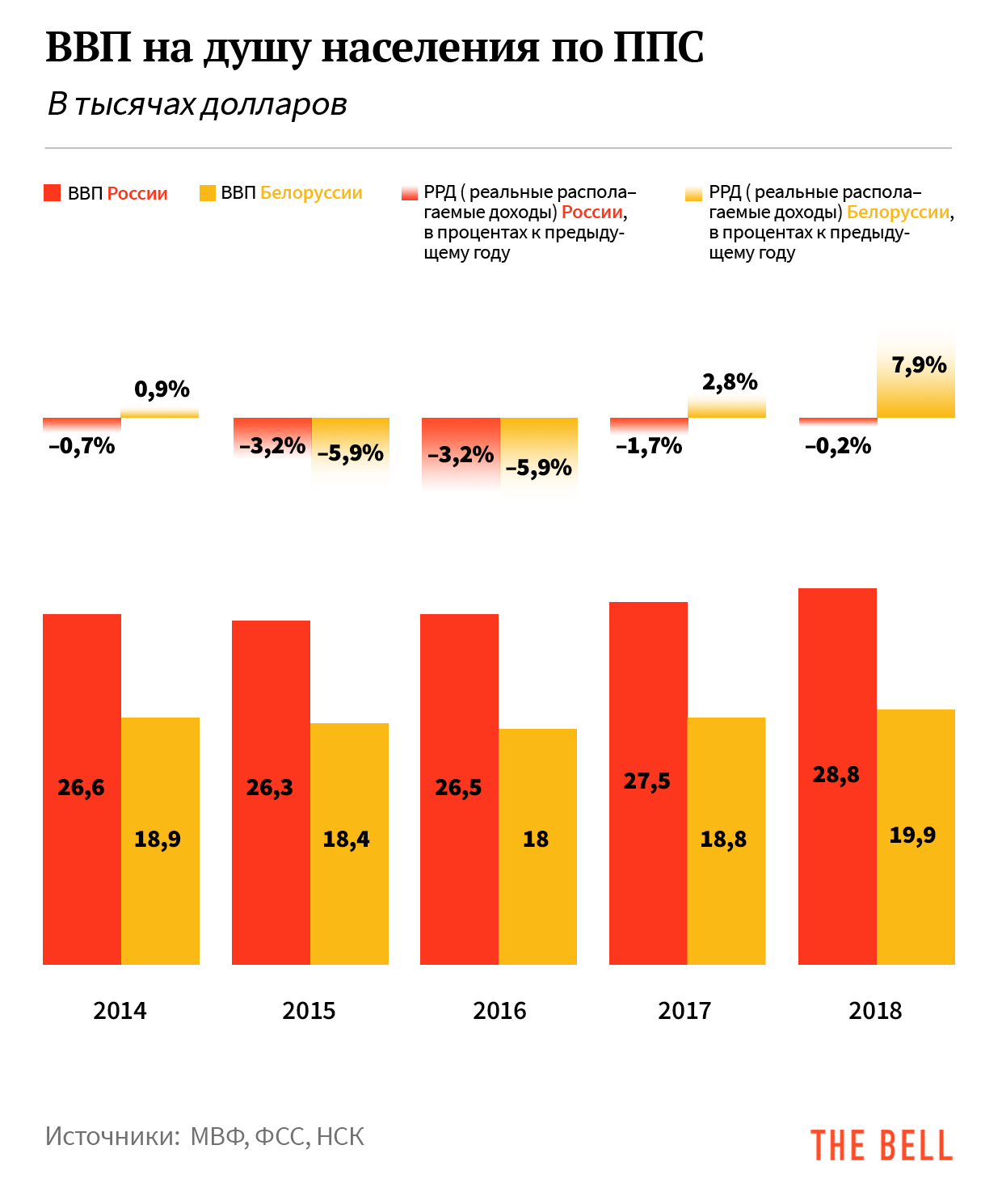 В России ВВП на душу населения в последние девять лет стабильно на 30% выше, чем в Белоруссии. В 2019 году в России этот показатель, по оценке МВФ, составит $29,6 тысячи, в Белоруссии — $20,6 тысячи. Но этот показатель мало что говорит о реальном финансовом положении отдельного гражданина — хоть и оценивается «в пересчете» на него.