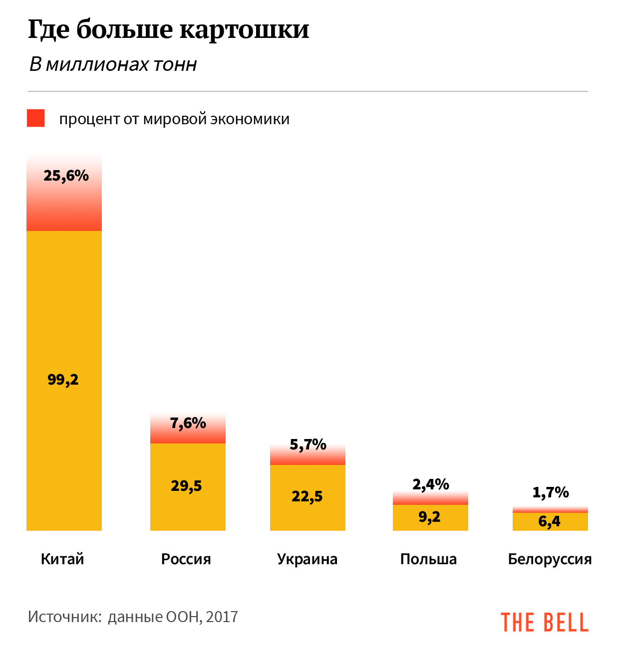 В Китае вырастили 99 млн т, в России — 29,5 млн, на Украине — 22,2, а в Белоруссии — всего 6,4 млн. То есть на Белоруссию приходится всего 1,7% мирового объема, а на Китай — 25,6%. Вот такое развенчание «картофельного мифа».