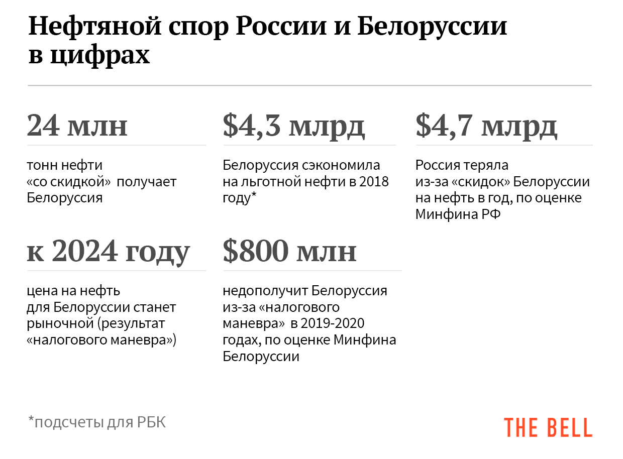 Белоруссия привыкла получать нефть по внутрироссийским ценам — поставки никогда не облагались экспортной пошлиной. По факту это работало как субсидия: Белоруссия как будто покупала нефть по мировой цене, а потом разницу с внутрироссийской ей «компенсировали». В 2018 году объем этих скрытых субсидий составил около $4,3 млрд, это около 8% ВВП Белоруссии, посчитал Александр Кнобель из РАНХиГС. Теперь цена будет расти. Белоруссия уже платит за нефть 80% экспортной цены, хотя пять лет назад платила 50%, пишет Bloomberg.