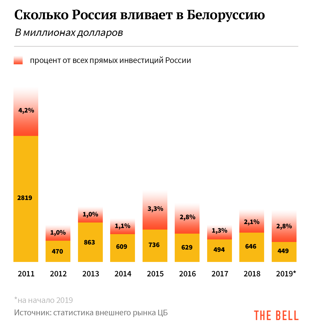 - Только прямые российские инвестиции в 2011–2019 годах, согласно данным ЦБ, составили почти $8 млрд. Но постепенно объем поддержки снижается. Если в 2011 году на Белоруссию приходилось 4,2% всех прямых инвестиций России, то в 2018-м — всего 2,1%.