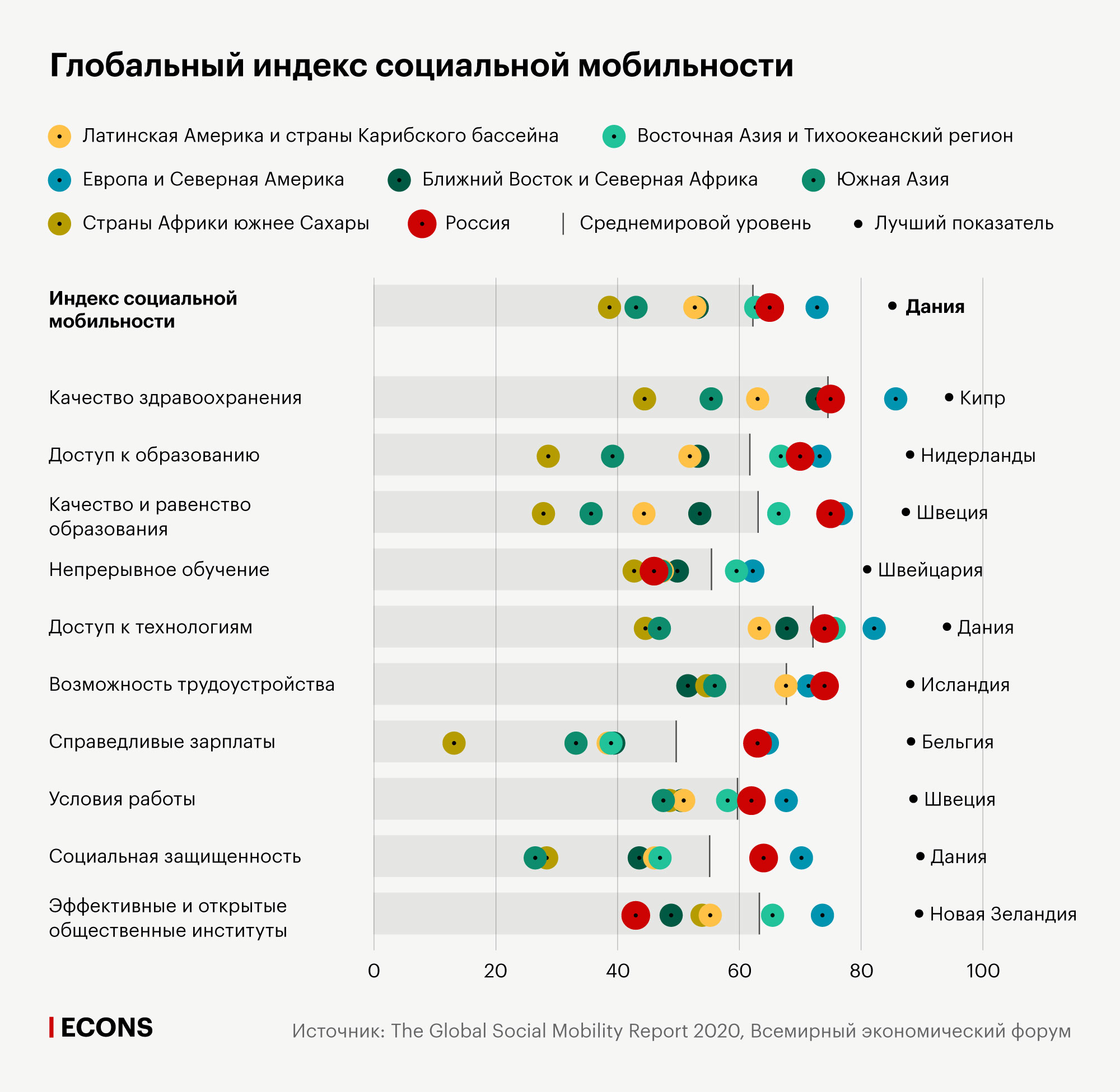 - Верхние десять строчек рейтинга занимают европейские страны, где уровень социальной мобильности максимальный. Первое место у Дании (набравшей 85,2 балла из 100 возможных), за ней следуют Норвегия (83,6), Финляндия (83,6), Швеция (83,5), Исландия (82,7), Нидерланды (82,4), Швейцария (82,1), Австрия (80,1), Бельгия (80,1) и Люксембург (79,8).