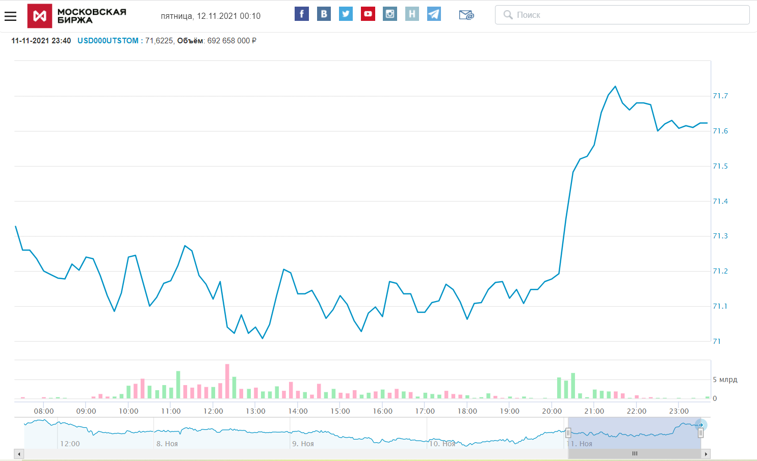 Новость появилась на сайте Bloomberg в 20:09 мск. Сразу после этого рубль на Московской бирже начал быстро падать, и к 21:30 подешевел к доллару на 60 копеек — с 71,2 до 71,8 руб./$. После этого произошла небольшая коррекция, и к полуночи рубль отыграл почти 20 копеек — до 71,63 руб./$.
