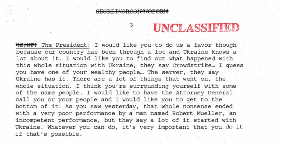 Трамп: Мне кажется, вы окружаете себя теми же самыми людьми, [которые были связаны со вмешательством в выборы в понимании Трампа]. <...> Я хотел бы, чтобы генпрокурор позвонил вам или вашим людям и вы во всем этом разобрались. Как вы видели вчера, вся эта бессмыслица завершилась очень плохим выступлением человека по имени Роберт Мюллер, некомпетентная работа. Говорят, что во многом это началось с Украины. Все, что вы можете сделать, — очень важно, чтобы вы это сделали, если это возможно.