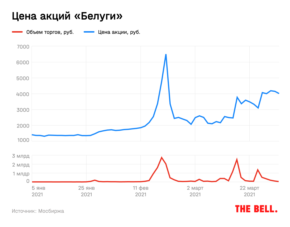 Взлет обычно низколиквидных акций производителя алкоголя «Белуга» стал чуть ли не главной темой на российском рынке в конце февраля 2021 года. С 13 по 19 февраля они подорожали в три с лишним раза: с 1951 до 6500 рублей. Объем торгов за один только день 18 февраля составил 2,7 млрд рублей против обычных для этой бумаги 4 млн рублей в день.