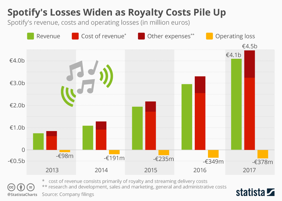• Выручка Spotify растет ошеломительными темпами: с $2,6 в 2016 до $4,9 млрд по итогам 2017 года. При всем этом пока Spotify работает в убыток: потери в 2017 году составили $1,5 млрд – почти вдвое больше, чем годом ранее. Как и в случае с другими технологическими компаниями, инвесторы пока закрывают на это глаза и надеются на дальнейший рост прибыли.