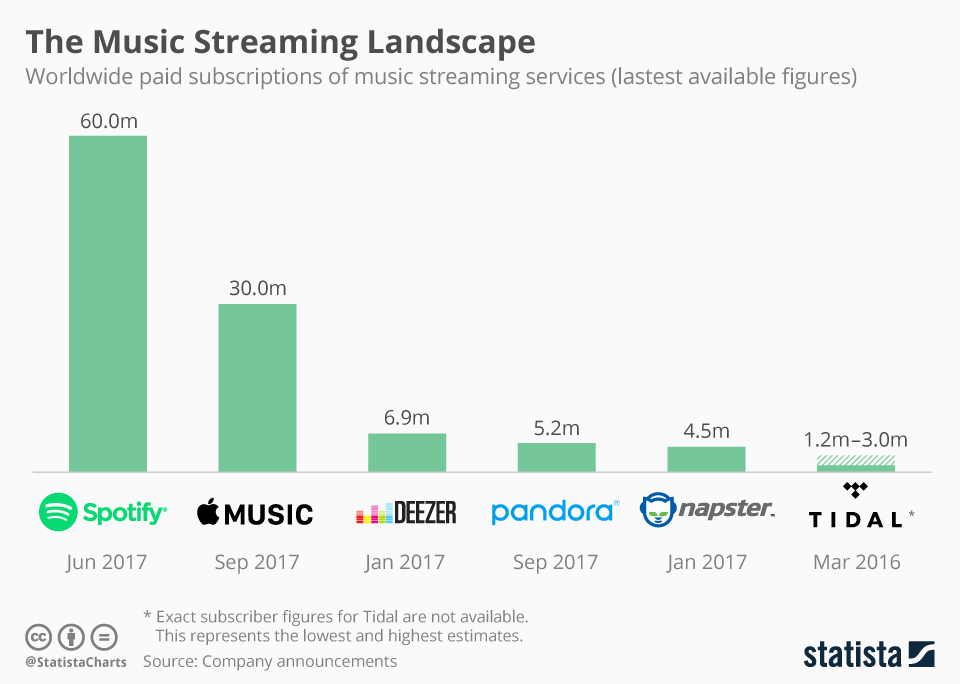 • Сегодня на Spotify приходится 40% мирового рынка музыкального стриминга – это позволяет ей получать все более выгодные условия у правообладателей. Число пользователей должно вырасти с 157 до 170 млн в текущим году, а платных подписчиков — с 72 до 90 млн. Для сравнения, у Apple Music сейчас более 37 млн подписчиков.