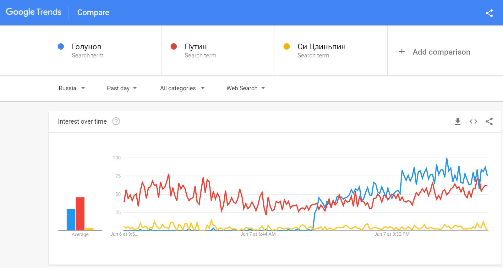 Высокопоставленные участники форума не знали, куда от этих вопросов деваться: обещали взять дело под личный контроль, как могли выражали солидарность. Впрочем, все то же самое было и в деле Калви. Самого Путина о судьбе Голунова журналистам спросить не удалось — не повезло с форматом пленарной сессии, который не предполагает вопросов из зала. Но можно без преувеличения сказать, что задержание Голунова испортило Владимиру Путину и Си Цзиньпину главный день форума. Вот чем, по данным сервиса Google Trends, интересовались в пятницу российские интернет-пользователи:
