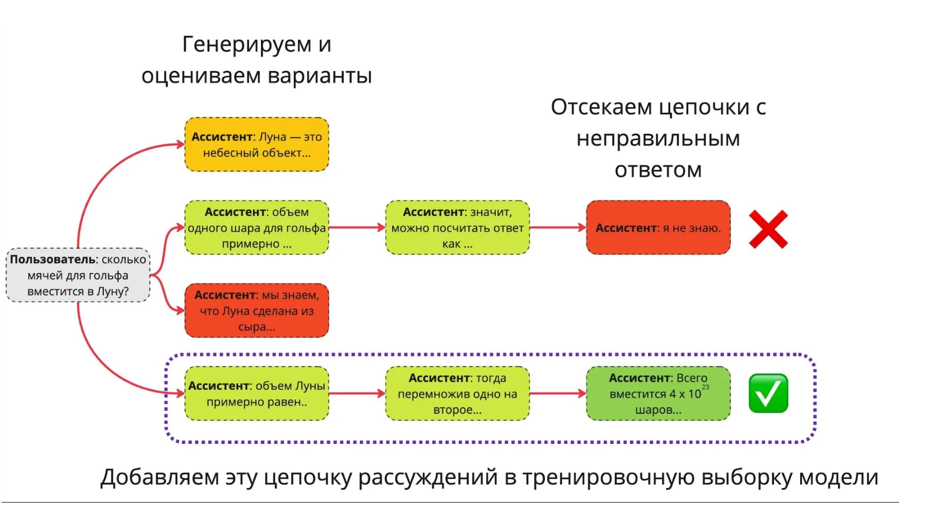 То есть LLM получает задачу, генерирует множество потенциальных путей решения до тех пор, пока не появится правильное (выше мы описали 5 способов проверки), и затем эта цепочка рассуждений добавляется в тренировочную выборку. На следующей итерации вместо обучения на написанных человеком решениях нейросеть дообучится на собственном выводе, закрепит полезное (приведшее к хорошему решению) поведение — выучит «фишки» игры — и начнет работать лучше.