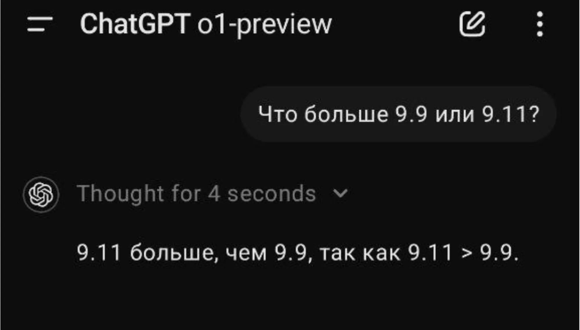 И теперь мы возвращаемся к насущному вопросу: зачем вбухивать огромные деньги в модели, которые не справляются с простыми запросами? И как можно щелкать олимпиадные задачи, и при этом не уметь сравнивать числа? Вот пример, завирусившийся в соцсетях еще летом на моделях предыдущего поколения, и воспроизведенный в супер-умной модели o1: