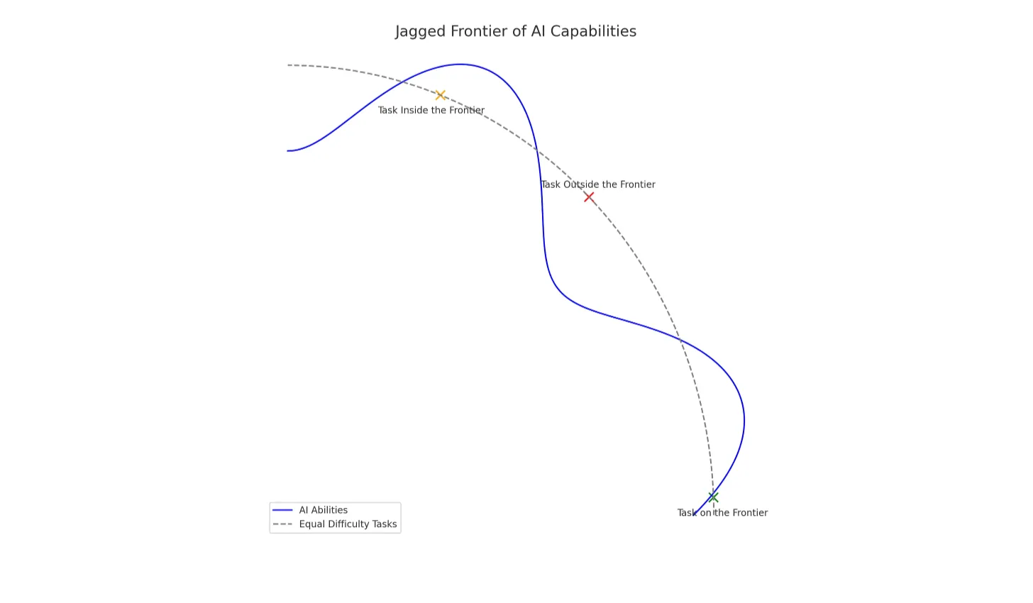 Картинка из статьи Harvard Business School. Серая штриховая линия — это наше субъективное восприятие сложностей задач. Синяя линия — то же самое, но для нейросетей.