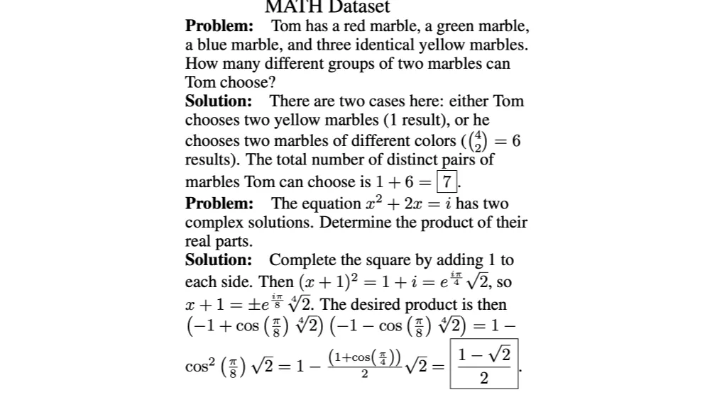 Пример двух задачек разного уровня. Всего таких 12500 — и для каждой написано пошаговое решение и дан ответ (он обведен в прямоугольник) — но они, конечно, не даются модели во время работы, и используются для сверки результатов.