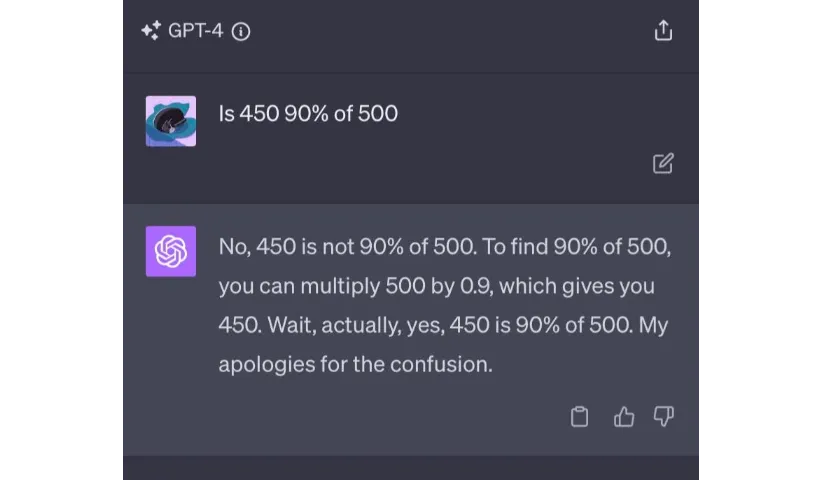 Даже если модель совершит ошибку, по умолчанию ее поведение подразумевает дальнейшую генерацию ответа, а не рефлексию и сомнения в духе «где ж это я продолбалась?». Хотя иногда случаются моменты просветления (но это редкость):