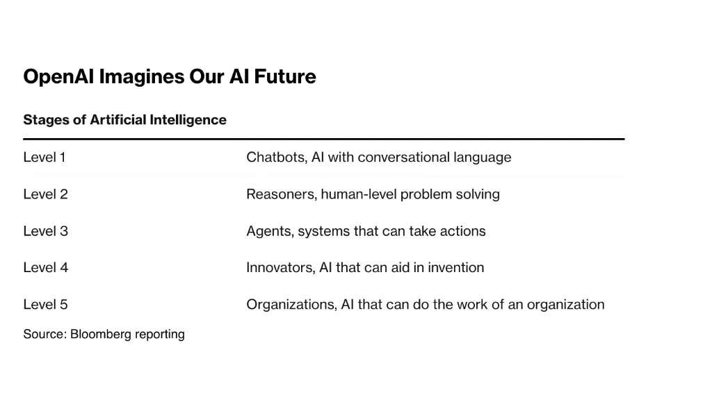 - 11 июля 2024 года. Издание Bloomberg рассказало, что в ходе внутренней демонстрации OpenAI показали концепцию из пяти уровней, помогающую отслеживать прогресс в создании ИИ. Диапазон варьируется от знакомого ChatGPT (уровень 1 — чатбот, поддерживающий беседу), до ИИ, который может выполнять работу целой организации (уровень 5 — кооперация, долгосрочное планирование, исполнение).