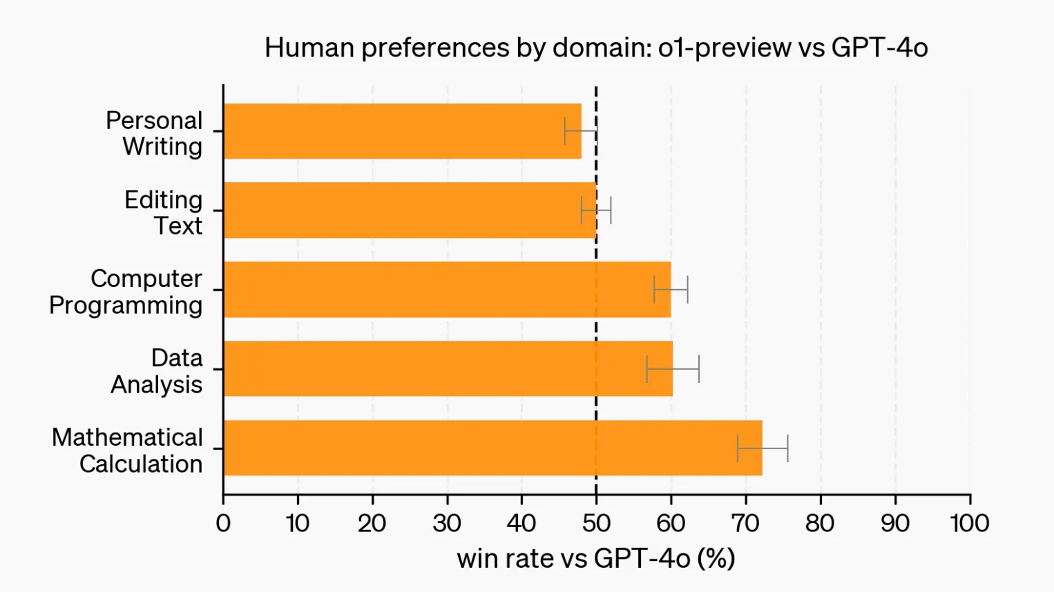 Как построили график выше: живые люди оценивали два разных ответа от двух моделей на один и тот же запрос. Последние брались из большого набора реальных запросов к моделям. Если пользователь просил помочь с редактированием текста, написанием писем, прочей рутиной — то ответы обеих моделей выбирались лучшими одинаково часто, разницы почти нет (но ее и не ожидалось). Но в вопросах, касающихся программирования, анализа данных или, тем более, математических вычислений разница статистически значимая. Можно сказать, что в среднем ответы o1 выбирали куда чаще, чем gpt4o.