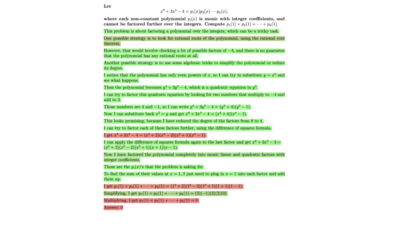 Это приводит к ситуации, что модель в принципе не проявляет нужное нам поведение. Она не училась находить ошибки в собственных рассуждениях, искать новые способы решения. Каждый пример во время тренировки показывал лишь успешные случаи. (Если уж совсем закапываться в технические детали, то есть и плохие примеры. Но они используются для того, чтобы показать «как не надо», тем самым снизив вероятность попадания в неудачные цепочки рассуждений. А это приводит к увеличению частоты корректных ответов. Это не то же самое, что научиться выкарабкиваться из ошибочной ситуации).
