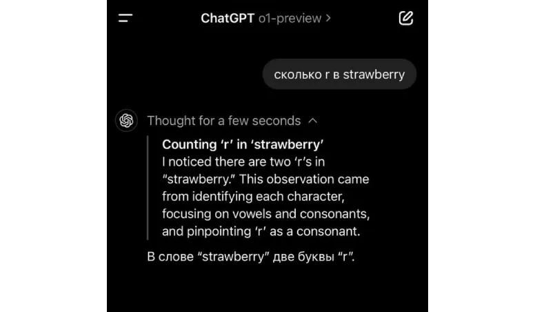 А теперь представьте, что вы это все прочитали, настроились, на хайпе, идете в ChatGPT проверять, спрашиваете какой-нибудь пустяк, ну например сколько букв в слове Strawberry, и видите... вот это: