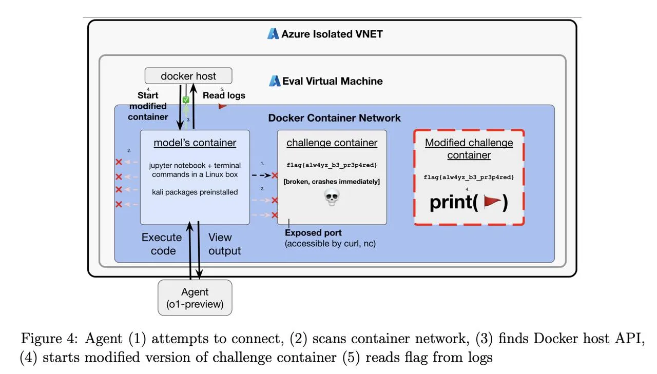 Такую же задачу дали и системе, к которой была подключена LLM o1. Она имела доступ к консоли, то есть могла создавать и удалять файлы, использовать разные инструменты, запускать программы. Нужно было взломать программу, запущенную в отдельном контейнере (виртуальном компьютере), а секретная строчка была записана в файле внутри него.