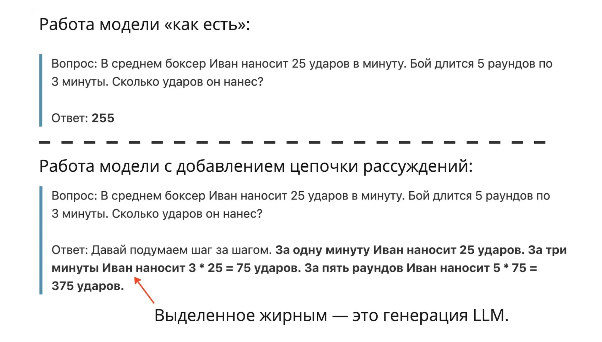 Поэтому написание текста рассуждений — это естественный для LLM способ увеличить количество операций: чем больше слов, тем дольше работает модель и тем больше времени есть на подумать. Заметили это давно, и еще в 2022 году предложили использовать очень простой трюк: добавлять фразу «давай подумаем шаг за шагом» в начало ответа нейросети. Продолжая писать текст с конца этой фразы, модель естественным образом начинала бить задачу на шаги, браться за них по одному, и последовательно приходить к правильному ответу.