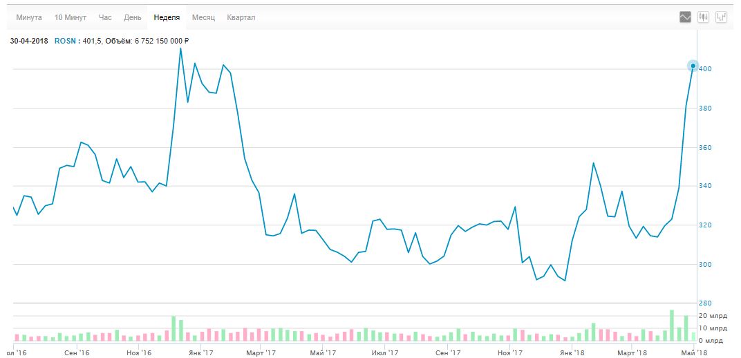 • Но с начала апреля «Роснефть» стала стремительно дорожать. Меньше чем за месяц, с 9 апреля по 2мая, акции компании выросли на 35% и приблизились к рекордным значениям. Сейчас одна обыкновенная акция «Роснефти» стоит 406 рублей, на историческом пике в декабре 2016 года — 410,5 рублей. Рост связан с тремя факторами — повышением цены на нефть на фоне выгодной для нефтяных компаний девальвации рубля и ростом уверенности в том, что «Роснефть» выплатит дивиденды в размере 50% от чистой прибыли.