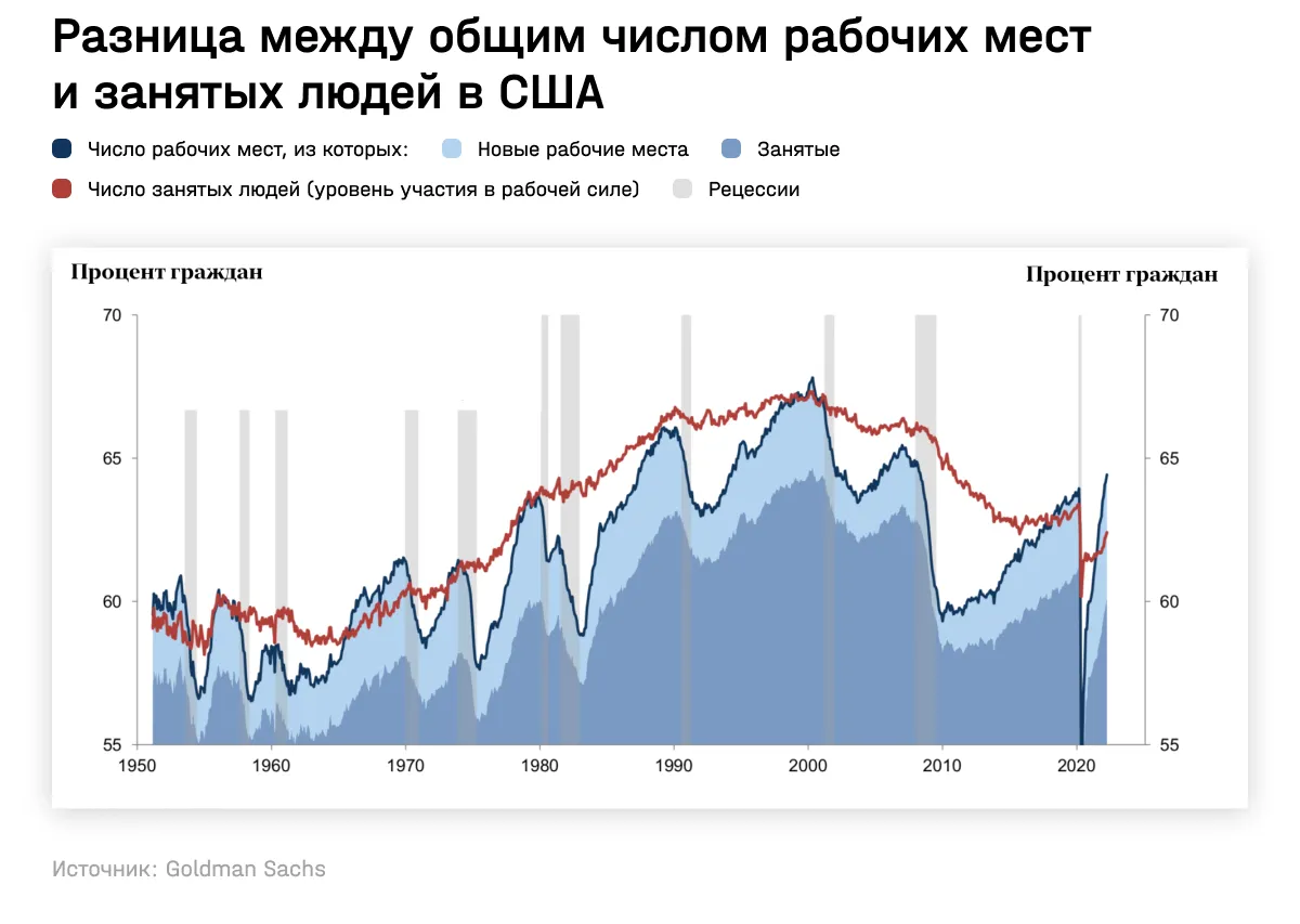 Главный вызов, с которым сейчас сталкивается ФРС, — дисбаланс спроса и предложения на рынке труда в США. Разница между общим числом рабочих мест в экономике и числом занятых в ней — максимальная в послевоенной истории. Этот показатель, в отличие от остальных (в том числе уровня безработицы), исторически был лучшим опережающим индикатором роста зарплат, отмечают аналитики.