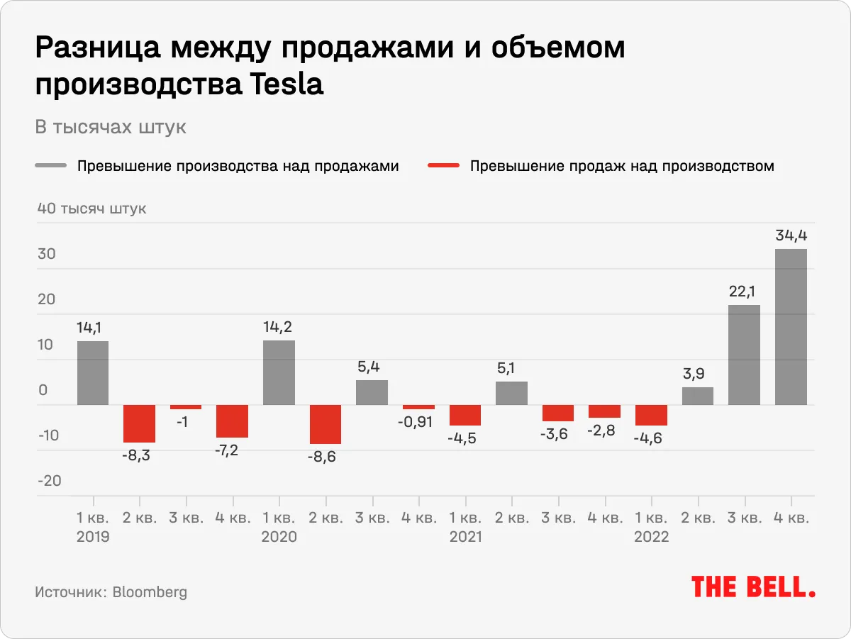 Снижение цен на ключевых рынках знаменует резкое изменение стратегии компании. В последние годы спрос на электромобили значительно превышал предложение. Еще в начале 2022 года время ожидания авто Tesla составляло 9 месяцев — теперь это в прошлом, пишут аналитики Morgan Stanley (отчет есть у The Bell). В четвертом квартале компания произвела на 34 тысячи авто больше, чем удалось продать. Это небольшой показатель, но тренд явно негативен (см. график ниже).