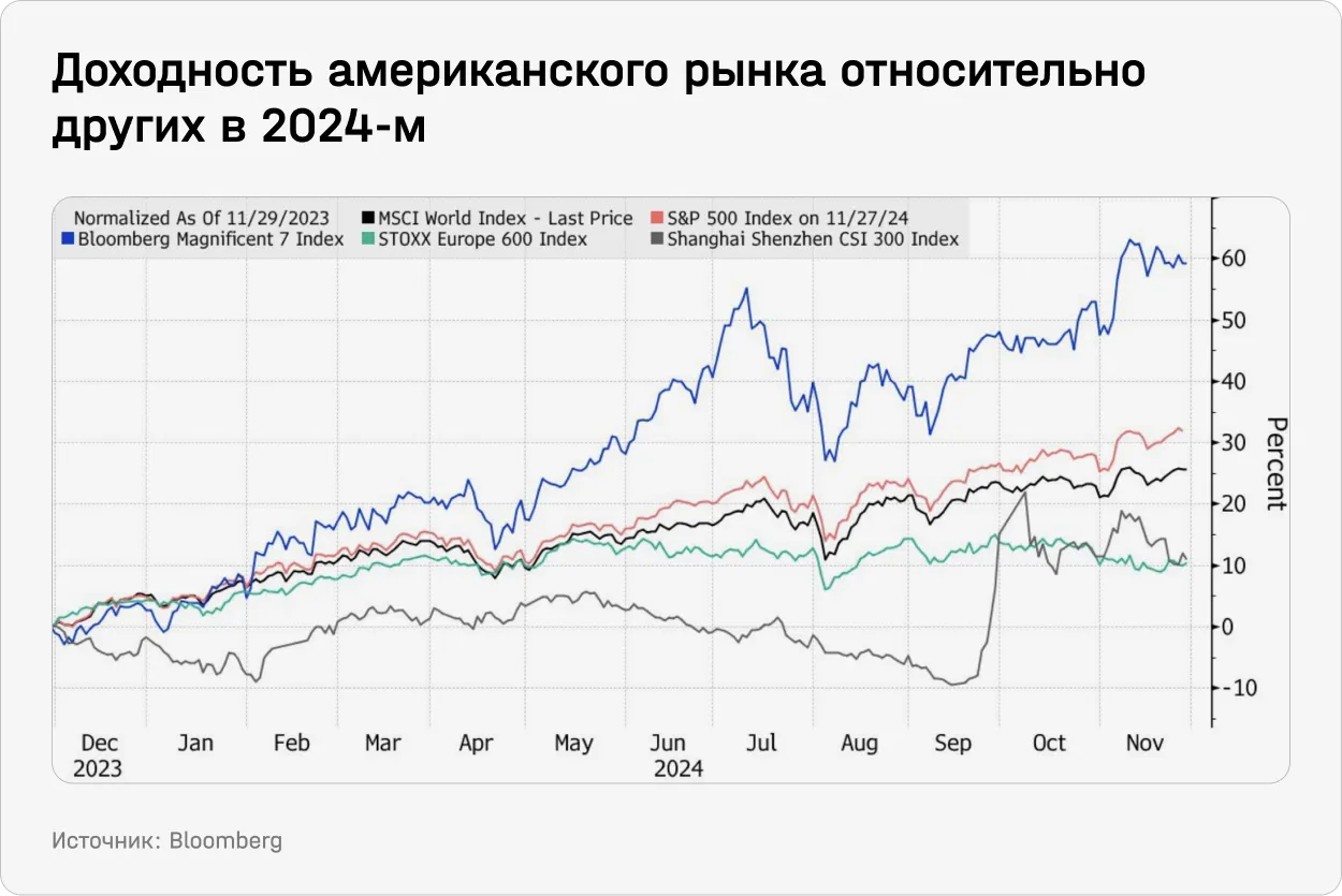 2024 год станет еще одним годом «исключительности» американского рынка: S&P 500 c начала года вырос на 28%, MSCI World ex. USA (за исключением США) — на 8%. Перед началом года мало кто из аналитиков предсказывал, что годовой рост американского рынка акций окажется одним из сильнейших в истории.