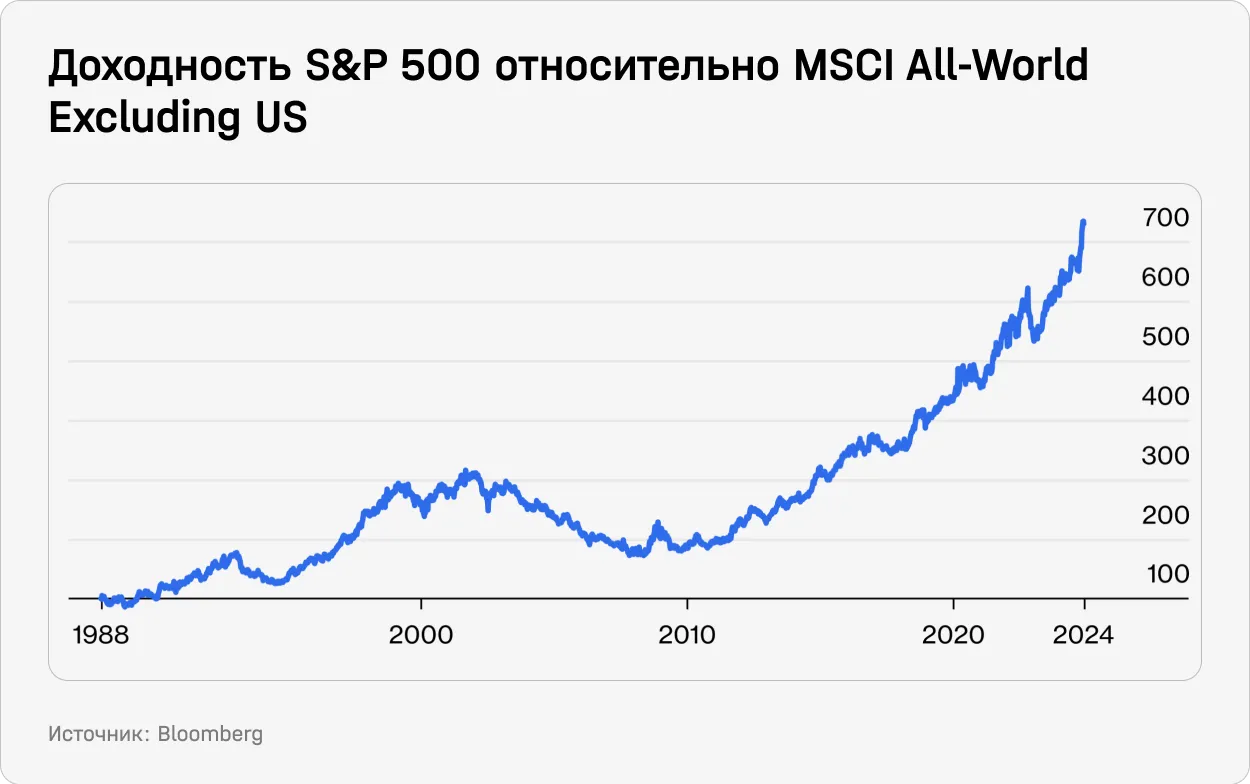 Банки, инвестиционные и управляющие компании продолжают публиковать свои прогнозы на 2025 год (о некоторых из которых мы рассказывали в последнем выпуске рассылки). Большая часть прогнозов сводится к тому, что опережающая доходность американского рынка относительно остальных продолжится. Во многом за счет того, что политика администрации Трампа, предполагающая снижение налогов и дерегулирование, поддержит американские акции и одновременно ударит по экономикам и компаниям за пределами США. Но в этом случае 2025 год лишь продолжит тренд, который длится уже почти 15 лет.