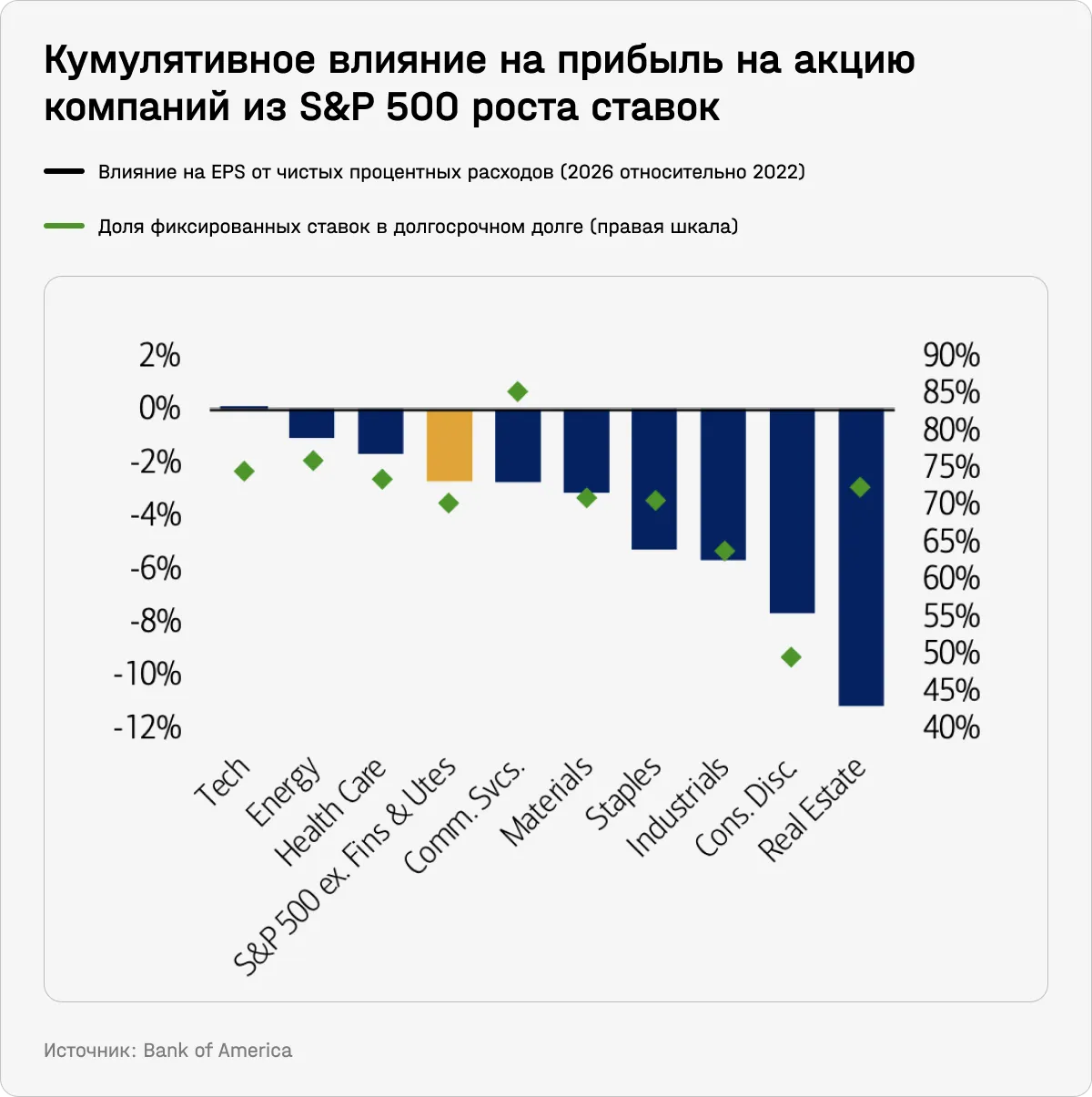 Хорошая новость: эффективная ставка по долгу для компаний из индекса S&P 500 начала расти, но пока она вернулась только на доковидный уровень. Кроме того, компании получают гораздо более высокий процентный доход от свободных денежных средств, что смягчает влияние более высоких процентных расходов. Даже если предположить, что стоимость долга к 2026 году составит ~7%, совокупное влияние на прибыль на акцию S&P 500 составит всего –3% (если исключить сектора финансов и коммунальных услуг).