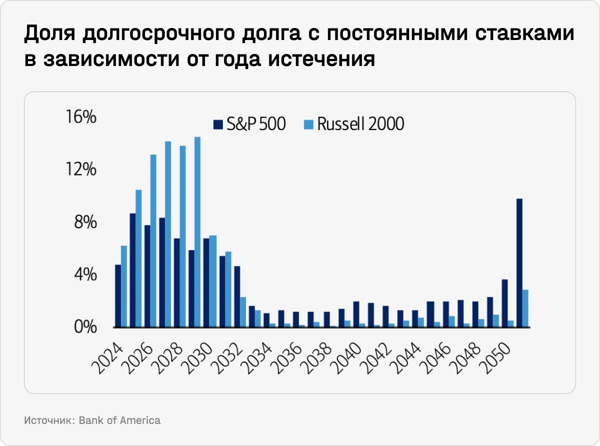 Реальный риск приближения к «стене (или обрыву) погашений» долга — у компаний из индекса Russell 2000, куда также входят компании средней и малой капитализации. График погашения их долгов смещен гораздо ближе к текущему моменту. Только 60% их долгосрочного долга выплачивается по фиксированным ставкам.