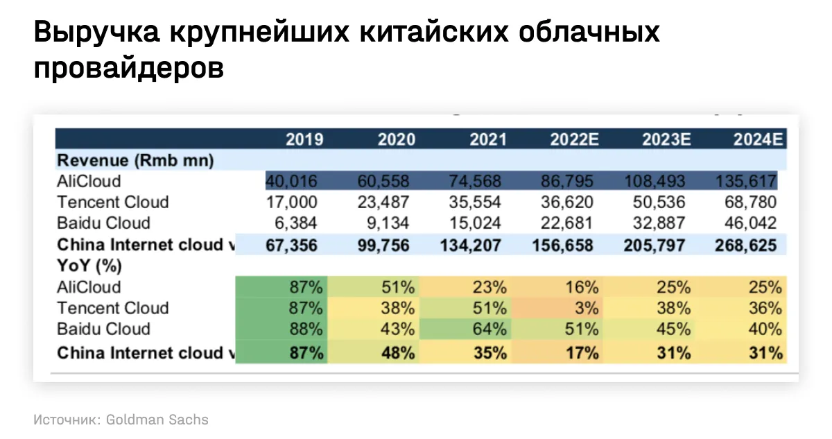 Облачные сервисы будут расти быстрее: менеджмент верит, что размер рынка может вырасти в 2-3 раза, до 1 трлн юаней, в ближайшие несколько лет — в ряде сфер внедрение облачных вычислений находится на ранней стадии и показывает сильный спрос со стороны компаний из финансового и телекоммуникационного секторов. Именно эти секторы, а также ритейл, дают все больший рост выручки облачного бизнеса Alibaba. Такой оптимизм разделяют и независимые организации. Так, согласно прогнозу аналитического агентства Canalys, ежегодные затраты на облачную инфраструктуру в Китае к 2026 году могут увеличиться более чем в 3 раза, почти до $85 млрд, что соответствует среднегодовому росту в 25%. В GS считают, что Alibaba сможет внедрить инновации в laaS и PaaS, параллельно снижая удельные издержки и увеличить эффективность.