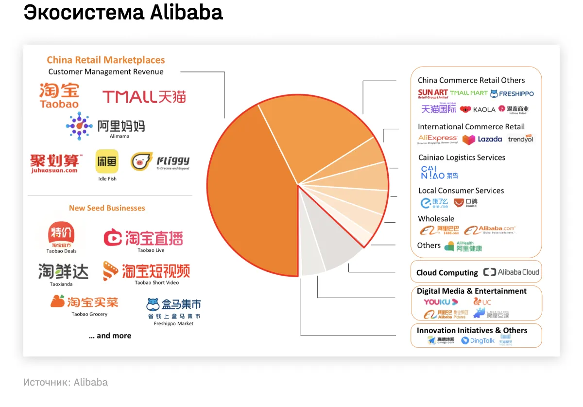 Сейчас Alibaba продолжает развивать онлайн-торговлю в Китае, где у нее уже более 1 млрд покупателей, проводит международную экспансию, а в ее экосистему входят облачные и другие сервисы. Из чего состоит ее бизнес?