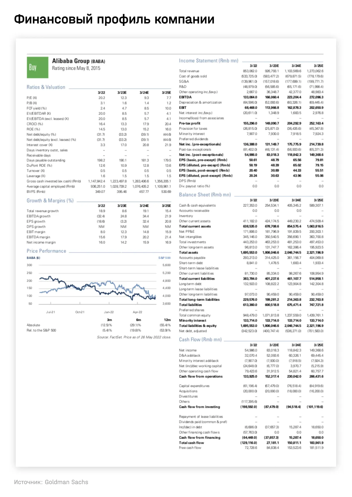 - Goldman Sachs в конце мая понизил прогноз стоимости акций Alibaba до $158 (HK$154). Тем не менее в инвестбанке считают, что компания сможет стабилизировать ситуацию с потерей рыночной доли в e-commerce в Китае, а также продолжить увеличивать международный бизнес и облачные сервисы.