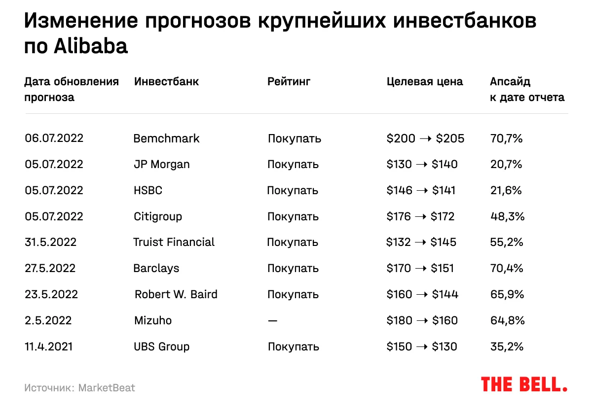 - В Argus советуют инвесторам с горизонтом в 12 месяцев держать акции Alibaba, с горизонтом в пять лет — покупать. Основная неопределенность в краткосрочной перспективе связана с ковидными ограничениями в Китае, что может негативно повлиять на потребительскую активность.