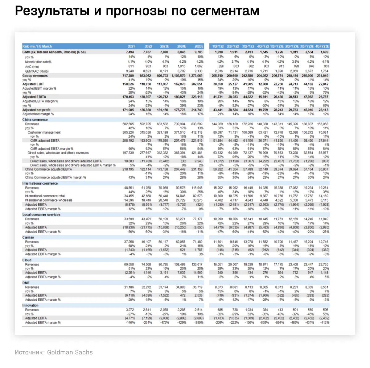 EBIT китайского сегмента электронной коммерции снизилась на 7,4 млрд юаней ($1,2 млрд), половина убытка пришлась на Taocaicai и Taobao Deals. Их убытки впервые начали сокращаться после пика, зафиксированного в прошлом квартале, и менеджмент планирует, что эта тенденция продолжится. В GS считают, что EBIT китайского сегмента e-commerce вернется к росту только через год, в четвертом квартале 2022-го.
