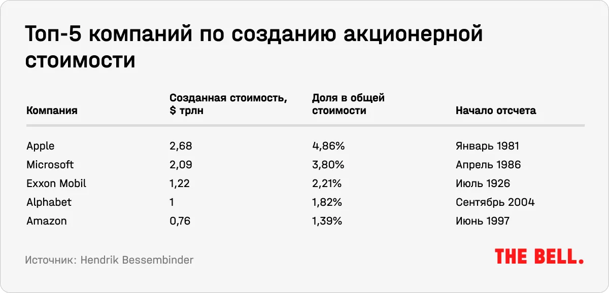 Узость нынешнего «ралли» не является чем-то необычным: исторически рынки толкают всего нескольких «суперакций», показало новое исследование Хендрика Бессембиндера из Государственного университета Аризоны. По его расчетам, на 72 из более чем 28 тысяч акций пришлось 50% всего роста американского рынка в 1926–2022 годы. При этом рост становится все более концентрированным: в то время как пять акций были ответственны за 10% роста рынка до 2016 года, к 2019 году их число сократилось до четырех, к 2023-му — до трех (Apple, Microsoft и Exxon Mobil).