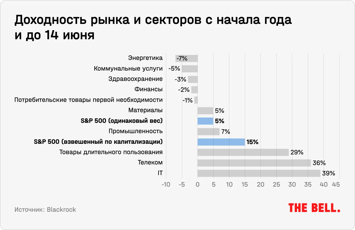Рост рынка был почти полностью обеспечен семью бигтехами. На волне хайпа вокруг ИИ Nasdaq 100 с начала года вырос на 37,5% — это лучший результат за первое полугодие с 1980-х. Как подсчитали в Blackrock, если бы S&P 500 не взвешивался по капитализации, а все компании обладали бы одинаковым весом, то индекс вырос бы только на 5%. В июне к IT присоединились сектора промышленности и материалов, что увеличило оптимизм по поводу продолжения ралли — рост в циклических секторах считается признаком начала «бычьего» рынка, отмечал Bloomberg.