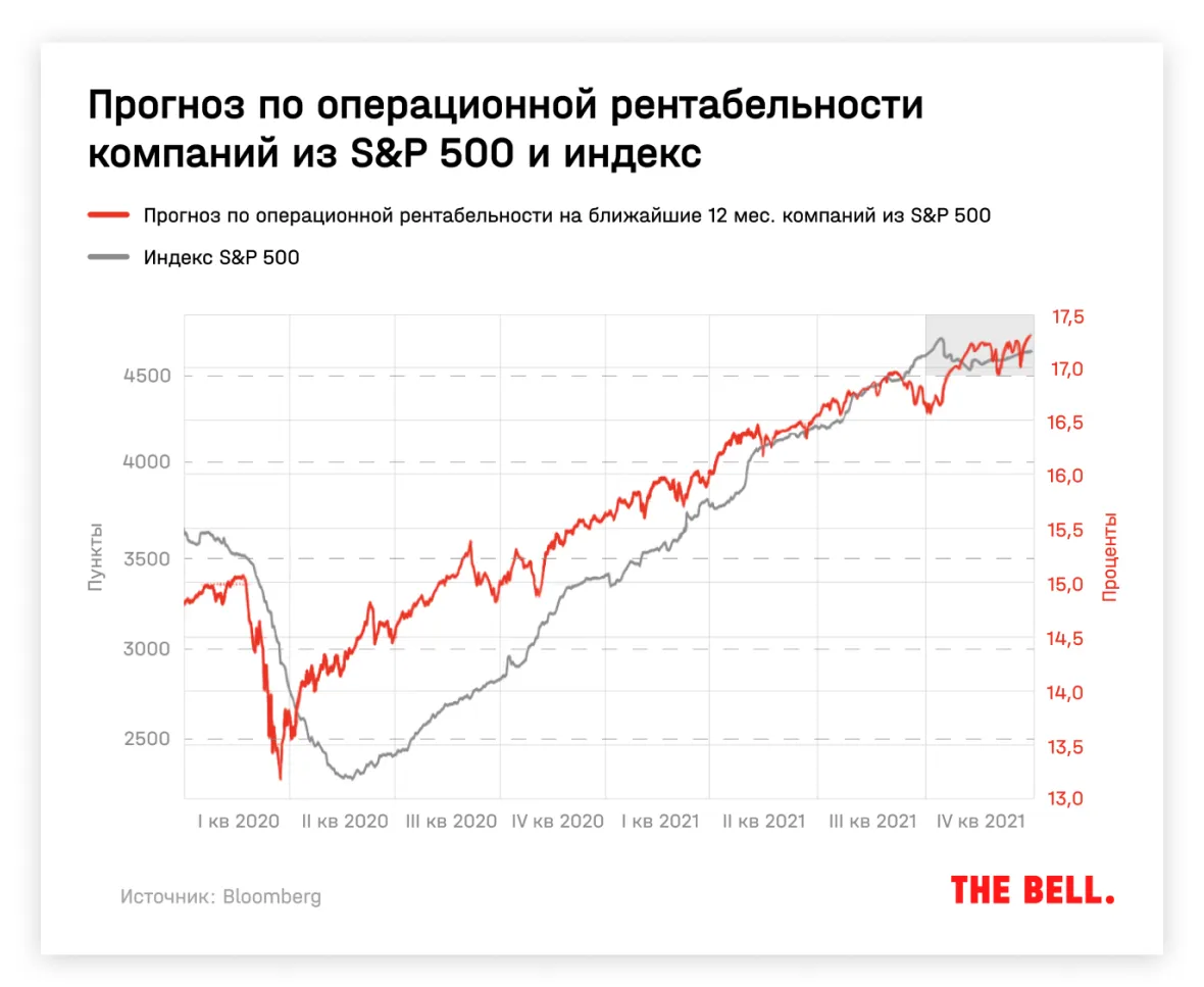 Отчет за третий квартал показал, что пока американским компаниям удается перекладывать на потребителей возросшие издержки. Однако устойчиво высокая инфляция вскоре может подорвать спрос: с середины октября прогноз по операционной рентабельности на ближайшие 12 месяцев компаний из индекса S&P 500 перестал расти, пишет Bloomberg. Инвесторам стоит проследить за результатами компаний за четвертый квартал 2021-го.