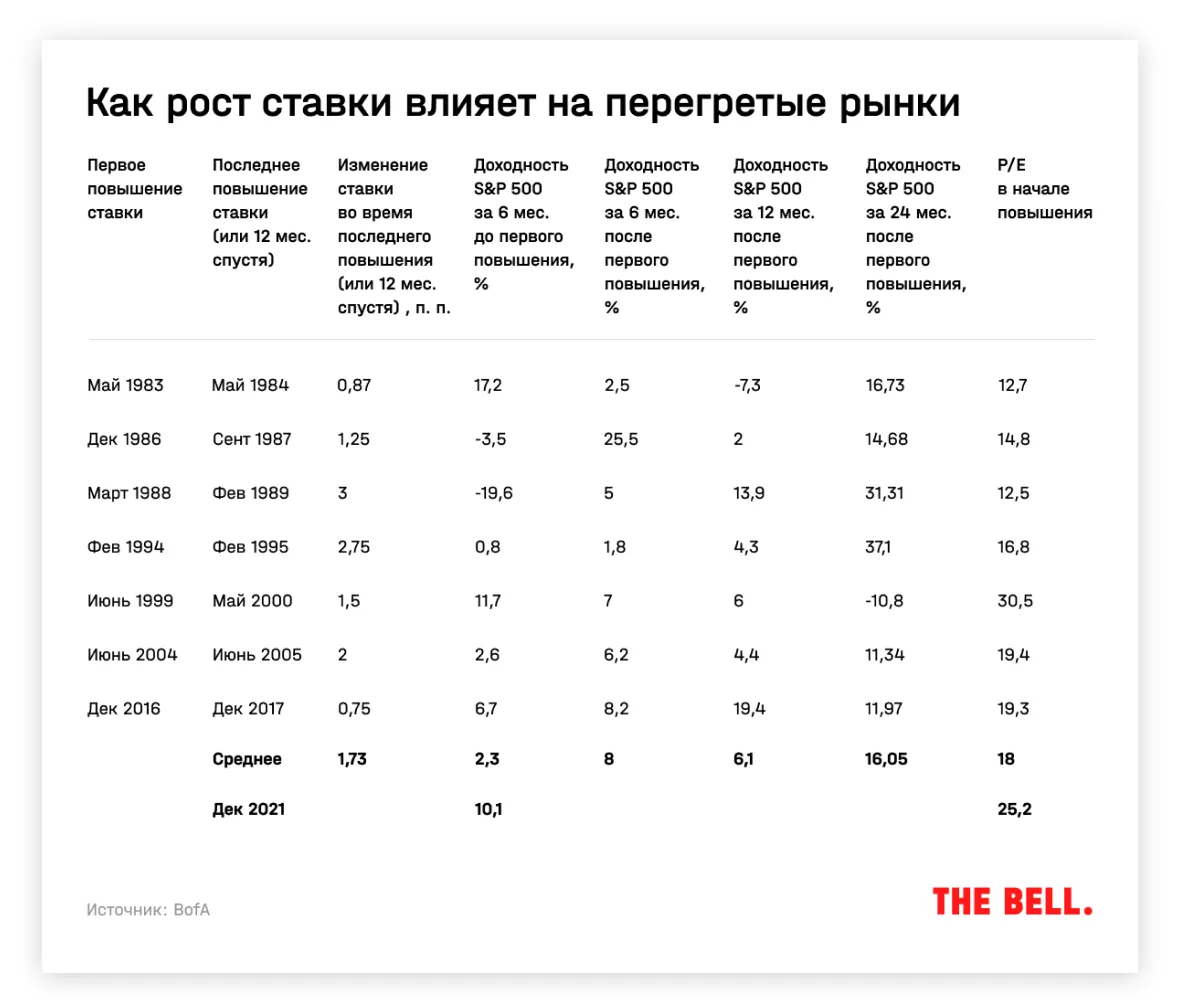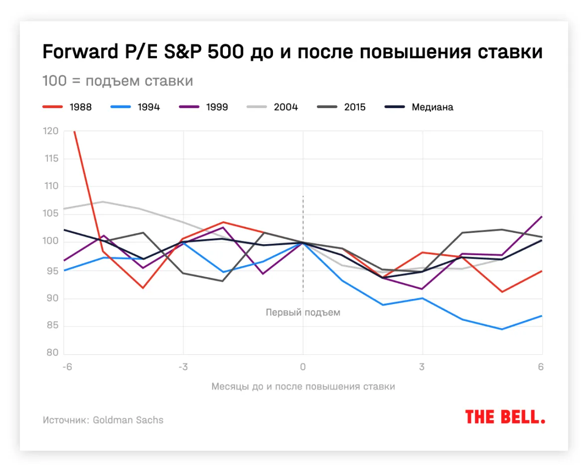 Повышение ставки — совсем не обязательно негатив для рынка акций, даже когда он оценивается дорого, пишут настроенные в целом скептично аналитики BofA. Но многие инвестбанки включают в свои отчеты разделы с историческими сравнениями с предыдущими циклами роста ставок — вероятно, потому что это один из немногих способов подкрепить свой прогноз эмпирическими данными.