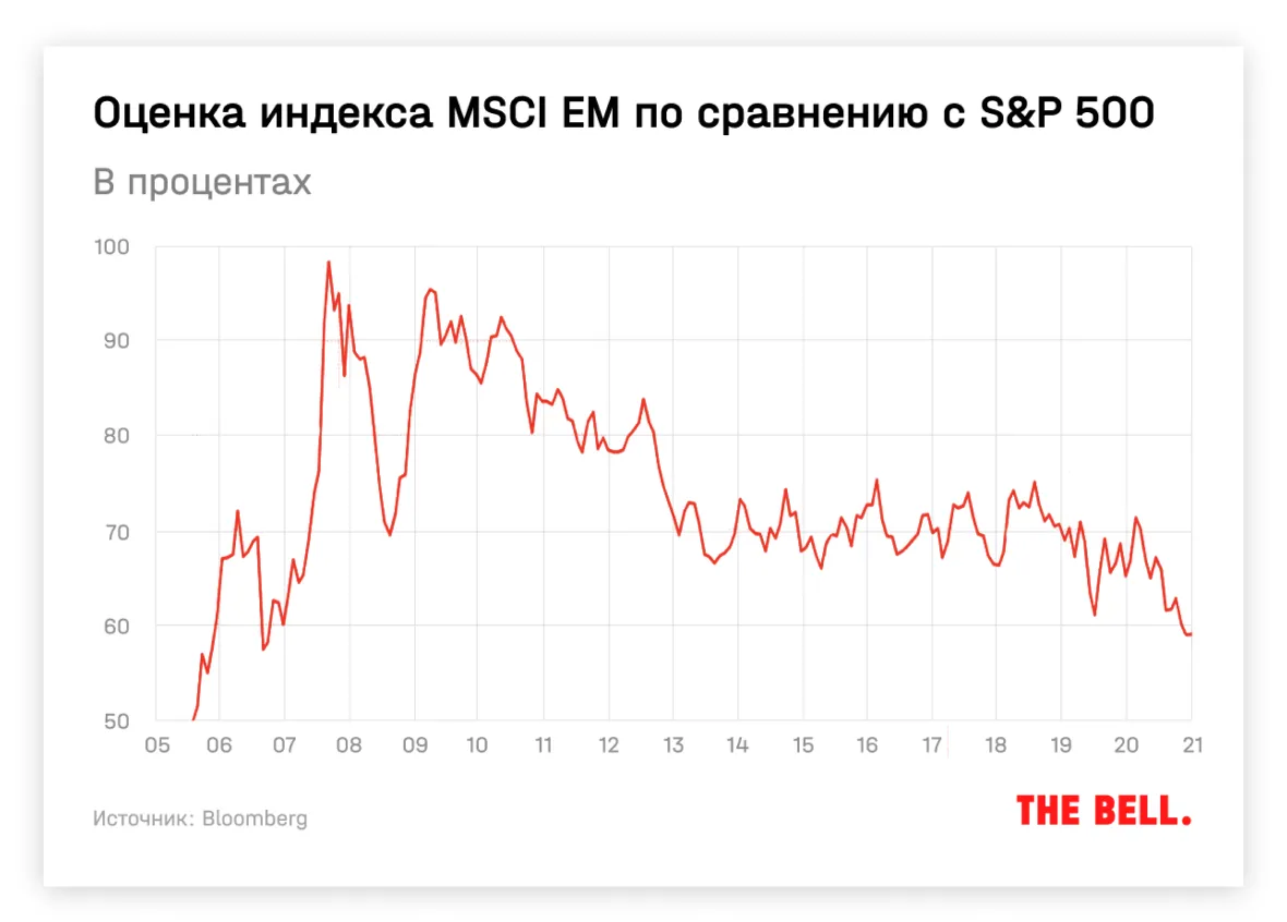 В 2022 году развивающиеся страны должны показать опережающую по сравнению с развитыми странами динамику — это консенсус аналитиков Goldman Sachs, Morgan Stanley и JPMorgan, пишет Bloomberg. В 2021 году развивающиеся рынки значительно отстали, прежде всего из-за Китая (подробнее об этом — здесь). В результате развивающиеся рынки торгуются с наибольшим дисконтом к развитым с 2001 года.