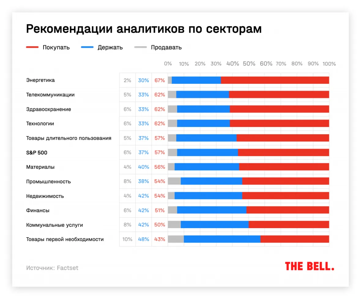 Наиболее оптимистично, если судить по более чем 10 тысячам рейтингов, собранным Factset, аналитики смотрят на сектор энергетики (благодаря высоким ценам на энергоресурсы и недоинвестированности в развитие новых месторождений), а также защитные сектора телекоммуникаций и здравоохранения. У них наибольшая доля рекомендаций «покупать».