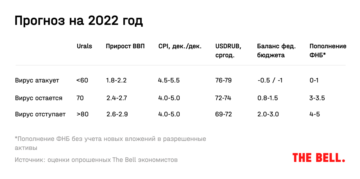 При составлении сценариев использовались оценки аналитиков ING , J.P. Morgan Research и старшего директора группы по природным ресурсам и сырьевым товарам Fitch Дмитрия Маринченко, директора группы суверенных рейтингов и макроэкономического анализа АКРА Дмитрия Куликова, директора Института народно-хозяйственного прогнозирования РАН Александра Широва и главного экономиста Альфа-банка Наталии Орловой, которыми они поделились с The Bell.