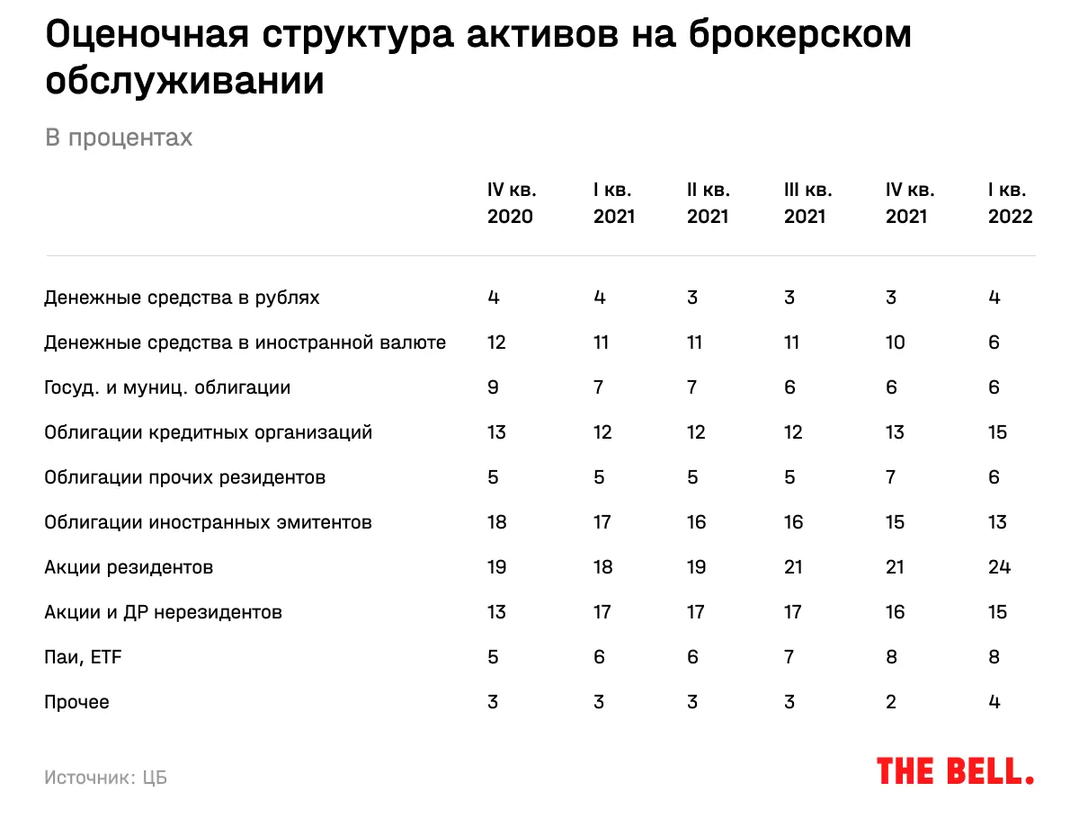 На иностранные бумаги — акции и облигации нерезидентов — по данным на конец 2021 года, приходился 31% всех активов на брокерском обслуживании. К концу первого квартала 2022 года этот показатель снизился до 28%, в том числе благодаря чистому оттоку из иностранных акций примерно на 200 млрд рублей, следует из вышедшего на днях обзора ЦБ. В нем оценочная стоимость ценных бумаг на счетах частных инвесторов уже не приводится.