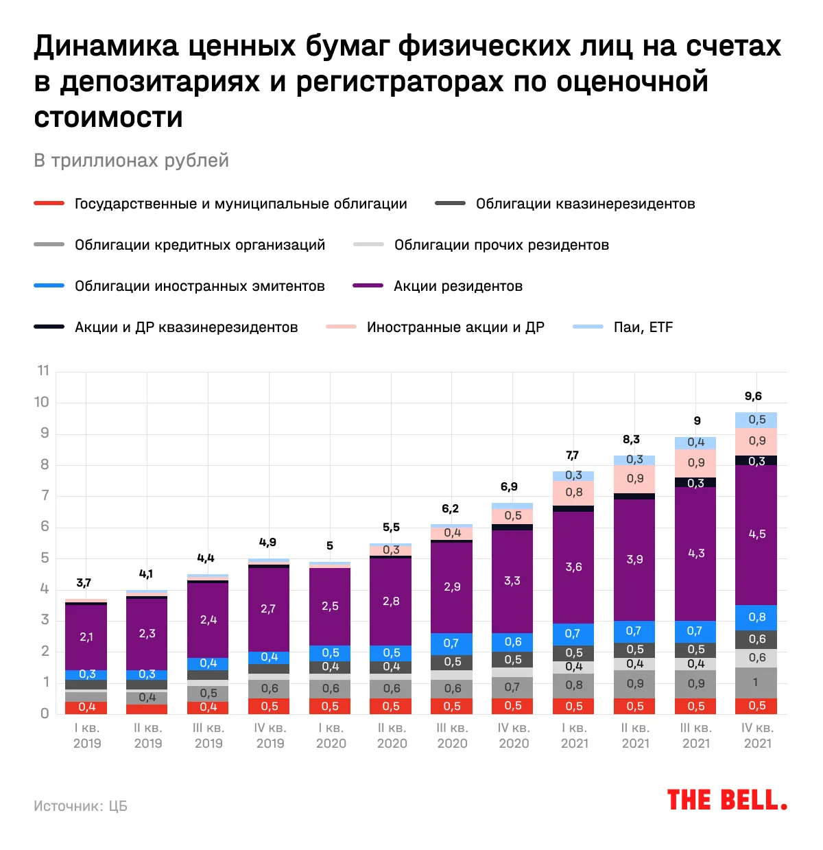 Блокировка иностранных бумаг воспринимается рынком крайне болезненно. В последние годы российские частные инвесторы активнее всего увеличивали вложения именно в них, и прежде всего в акции. Вo втором квартале 2020 года вложения в иностранные акции и депозитарные расписки составляли только 0,3 трлн рублей, а к концу 2021 года — уже 0,9 трлн. Еще 0,8 трлн по состоянию на конец прошлого года пришлись на вложения в облигации иностранных эмитентов, 0,6 трлн — облигации квазинерезидентов.