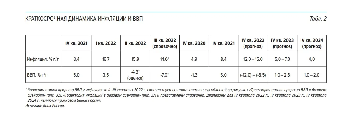 1. По оценке ЦБ, российский ВВП в третьем квартале 2022 года упадет на 7%, инфляция составит 14,6%. Прогноз по итогам года соответствует объявленному Эльвирой Набиуллиной после последнего снижения ставки 22 июля: спад ВВП на 4-6%, инфляция 12-15%.