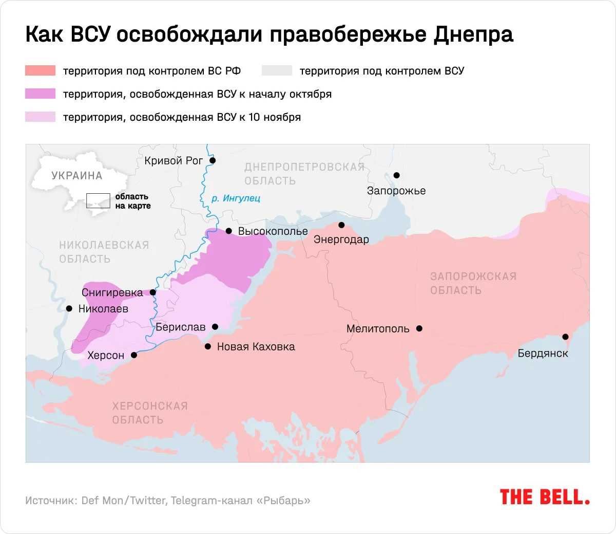 Украинские войска постепенно занимают оставленные ВС РФ территории на правом берегу. Владимир Зеленский в вечернем обращении объявил, что украинские силы специальных операций уже вошли в Херсон, а The Washington Post сообщила, что ВСУ уже взяли под контроль три района города и вышли к берегу Днепра. Украинские СМИ утверждают, что ВСУ вошли и в стратегически важный Берислав, находящийся по другую сторону Днепра от подконтрольной России Каховской ГЭС.